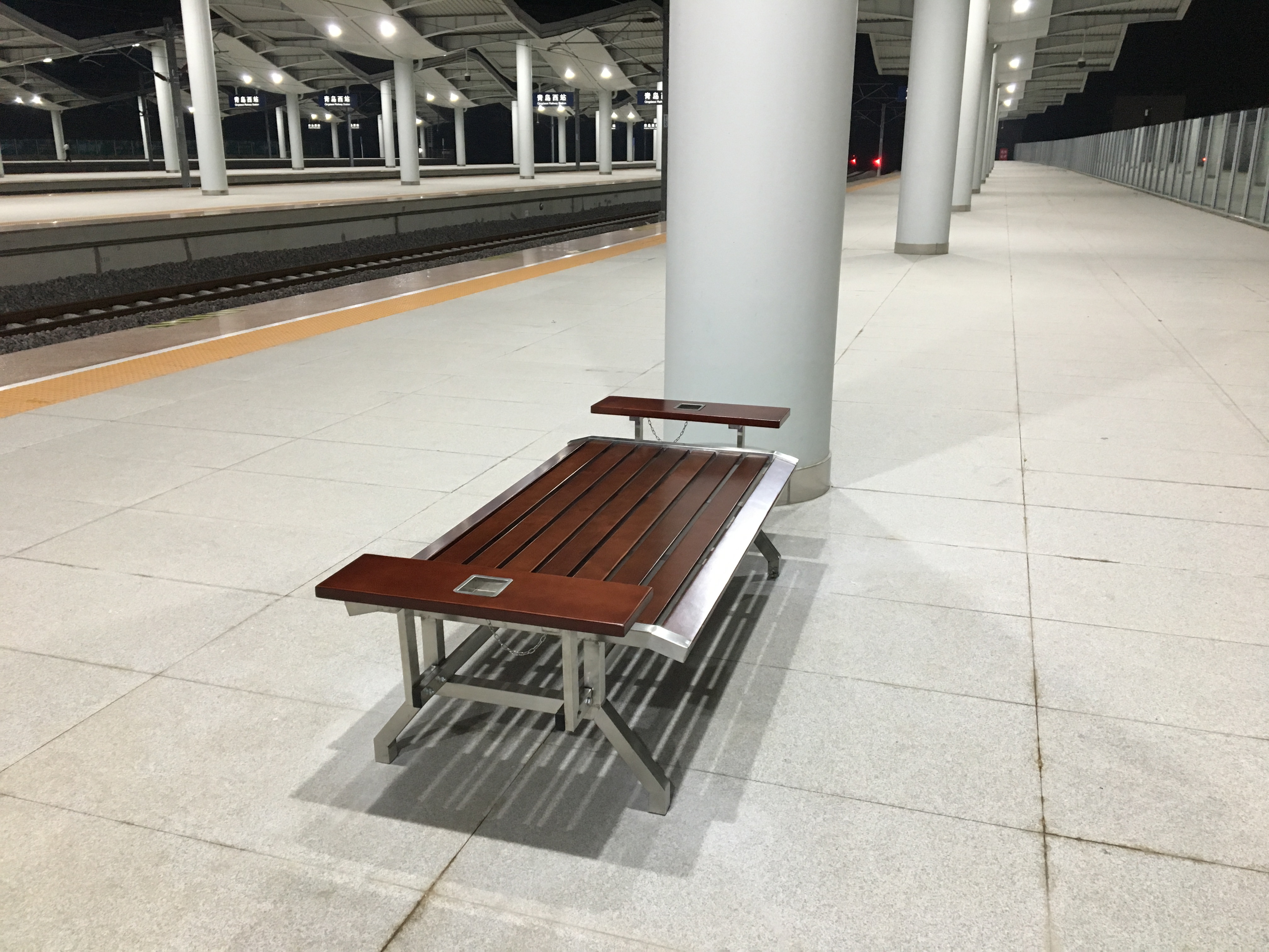 青岛西火车站由于刚刚开始正式运营只有几个月的时间,站内有些设施还并不完善,如火车站内站台上的座椅。近日青岛西站在我们青岛鑫金邦一次采购了16套不锈钢座椅,将它们安装在站台后就可供旅客在等车时休息用。